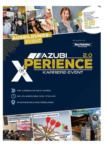 Erlebe die innovative Ausbildungsmesse deiner Region in entspannter Atmosphäre! Die AzubiXperience bietet dir spannende Einblicke, wertvolle Kontakte und coole Goodies. Sei am 23.03.26 zwischen 13:30 Uhr und 17 Uhr im Movieworld Kino Nördlingen dabei!